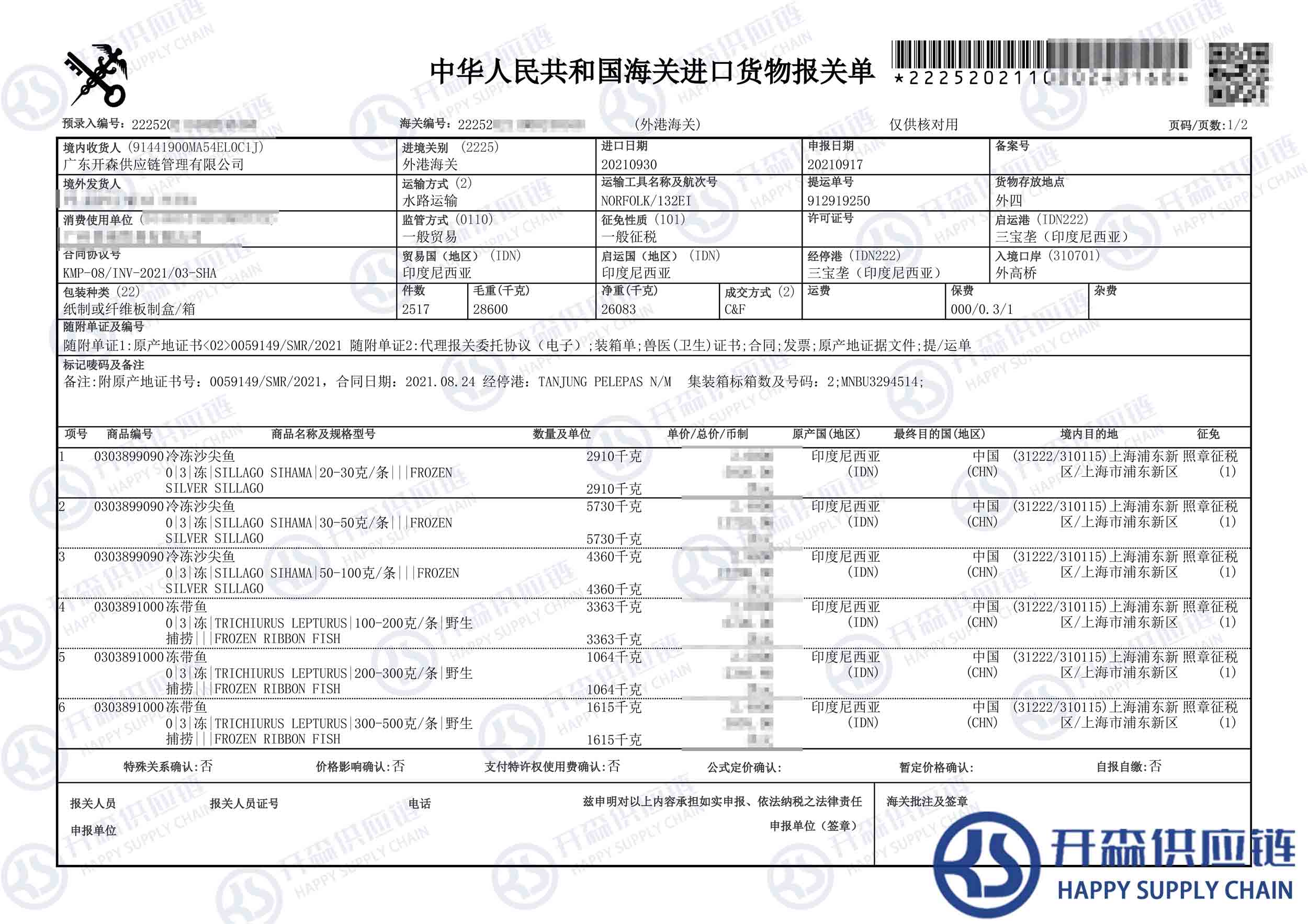 【本文結語】 上述就是印度尼西亞冷凍沙尖魚進口報關代理服務【經典案例】的全部內容,希望能對您有所幫助,如有水產品進口報關上任何疑問及問題可隨時在線聯系我們或撥打 18002611553,開森供應鏈擁有豐富的水產品進口報關操作經驗及案例,10余年進口經驗為您所用,各類進口疑難都能為您一一解答及協助快速處理解決!
