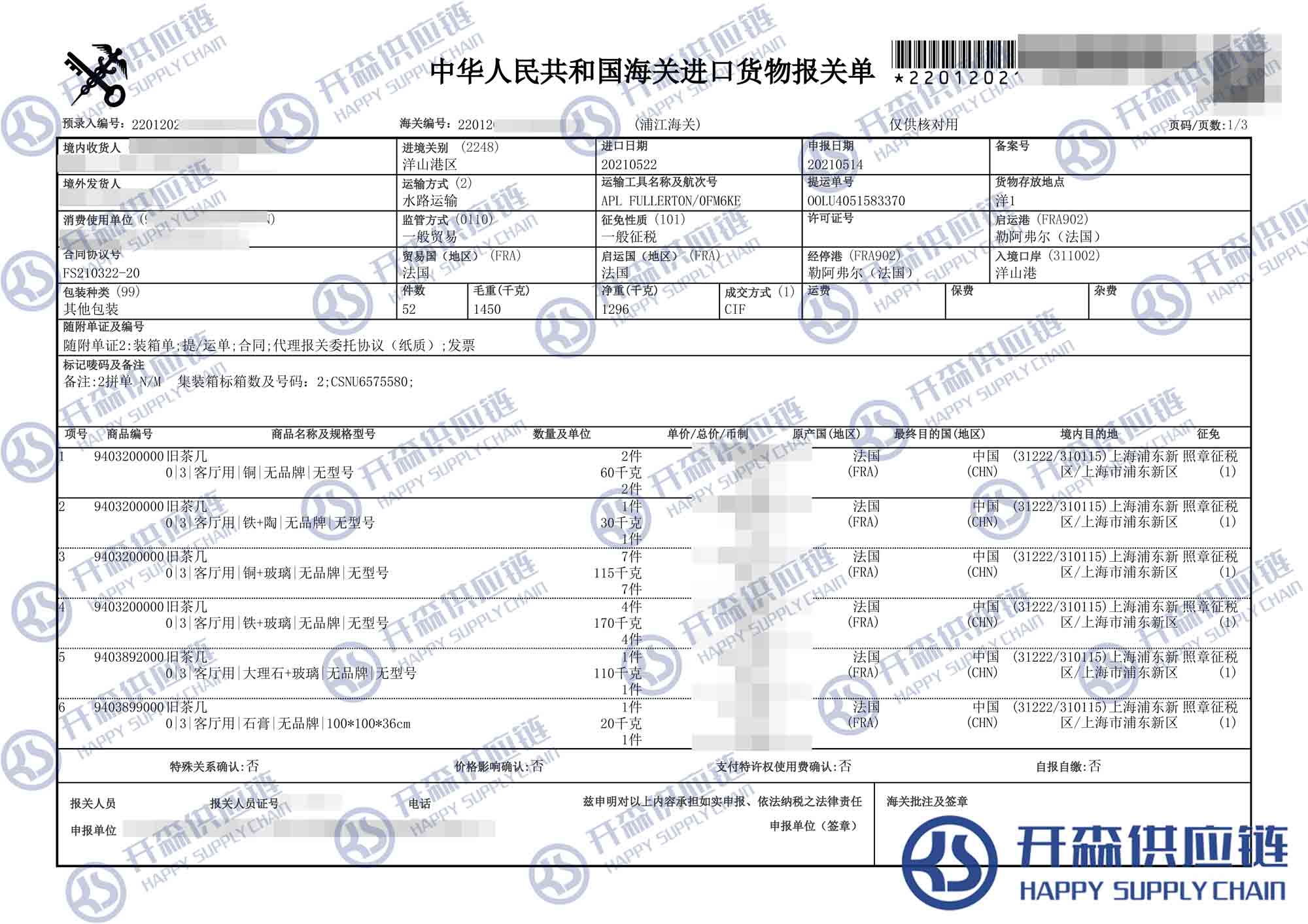 【本文結語】 上述就是法國二手舊茶幾家具進口報關代理案例【經典案例】的全部內容,希望能對您有所幫助,如有二手家具進口報關上任何疑問及問題可隨時在線聯系我們或撥打 18002611553,開森供應鏈擁有豐富的二手家具進口報關操作經驗及案例,10余年進口經驗為您所用,各類進口疑難都能為您一一解答及協助快速處理解決!