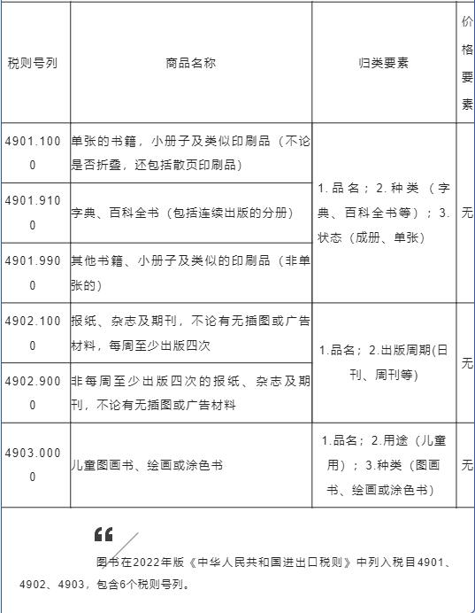 根據(jù)《中華人民共和國海關(guān)進(jìn)出口商品規(guī)范申報目錄及釋義(2022)》的規(guī)定,企業(yè)申報進(jìn)口圖書應(yīng)明確申報以下要素:(如下表)