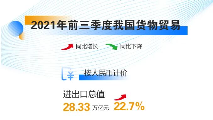 【導讀】您正在閱讀的是關于【外貿(mào)數(shù)據(jù)】2021年前三季度我國進出口總值28.33萬億元,同比增長22.7% !的內(nèi)容,本文由開森進口代理小編整理編寫,希望能對您有所幫助!