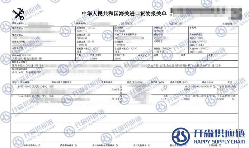 【本文結語】 上述就是寧波港舊臥式舊加工中心機床進口報關代理服務【經典案例】的全部內容,希望能對您有所幫助,如有舊加工中心進口報關上任何疑問及問題可隨時在線聯系我們或撥打 18002611553,開森供應鏈擁有豐富的舊加工中心進口報關操作經驗及案例,10余年進口經驗為您所用,各類進口疑難都能為您一一解答及協助快速處理解決!