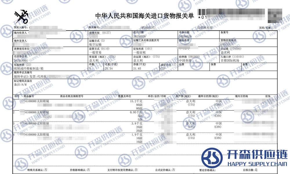 上述就是北京機(jī)場太陽眼鏡進(jìn)口報(bào)關(guān)代理服務(wù)【清關(guān)案例】的全部內(nèi)容,希望能對您有所幫助,如有進(jìn)口報(bào)關(guān),進(jìn)口報(bào)關(guān)代理公司,進(jìn)口報(bào)關(guān)代理上任何疑問及問題可隨時在線聯(lián)系我們或撥打 18002611553,開森供應(yīng)鏈擁有豐富的進(jìn)口報(bào)關(guān),進(jìn)口報(bào)關(guān)代理公司,進(jìn)口報(bào)關(guān)代理操作經(jīng)驗(yàn)及案例,10余年進(jìn)口經(jīng)驗(yàn)為您所用,各類進(jìn)口疑難都能為您一一解答及協(xié)助快速處理解決!