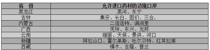 黑龍江省黑河、東寧,吉林省集安、長白、圖們、三合,內蒙古自治區二連浩特、滿洲里,廣西壯族自治區憑祥、東興、龍邦,云南省瑞麗、天保、景洪、河口,新疆維吾爾自治區阿拉山口、霍爾果斯、吐爾尕特、紅其拉甫,西藏自治區樟木、吉隆、普蘭等共22個邊境口岸作為中藥材進口通關口岸。